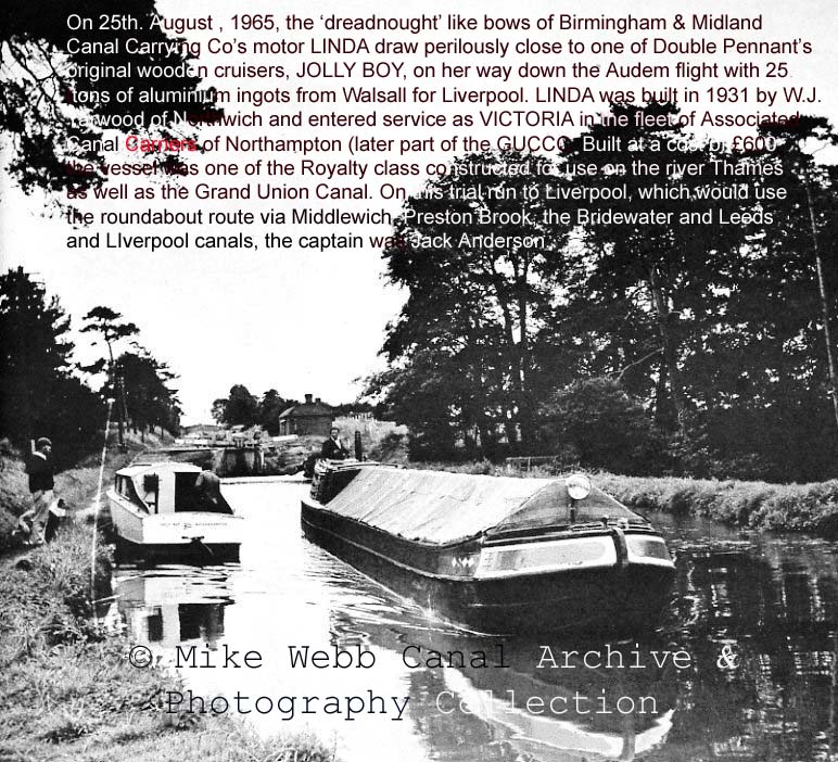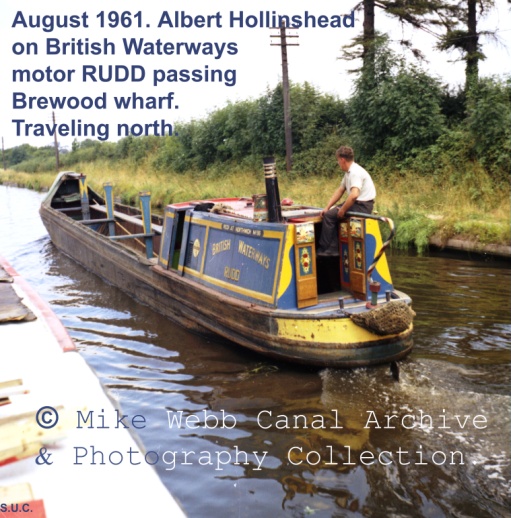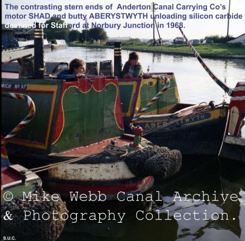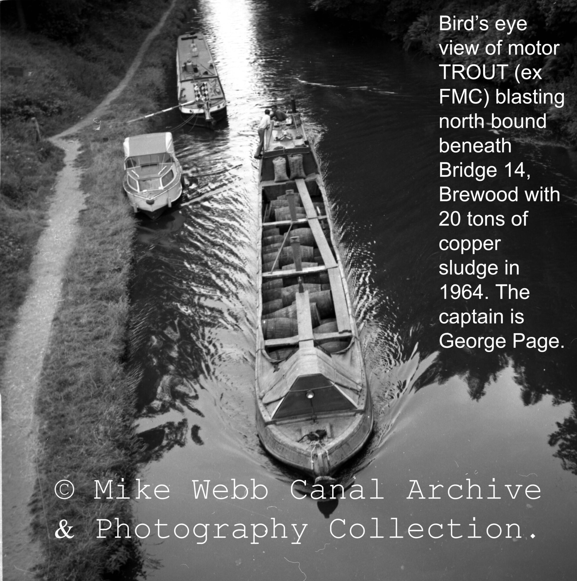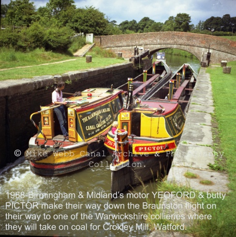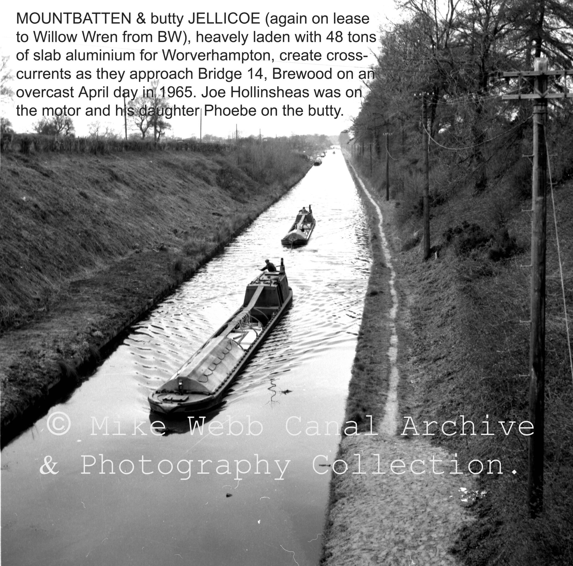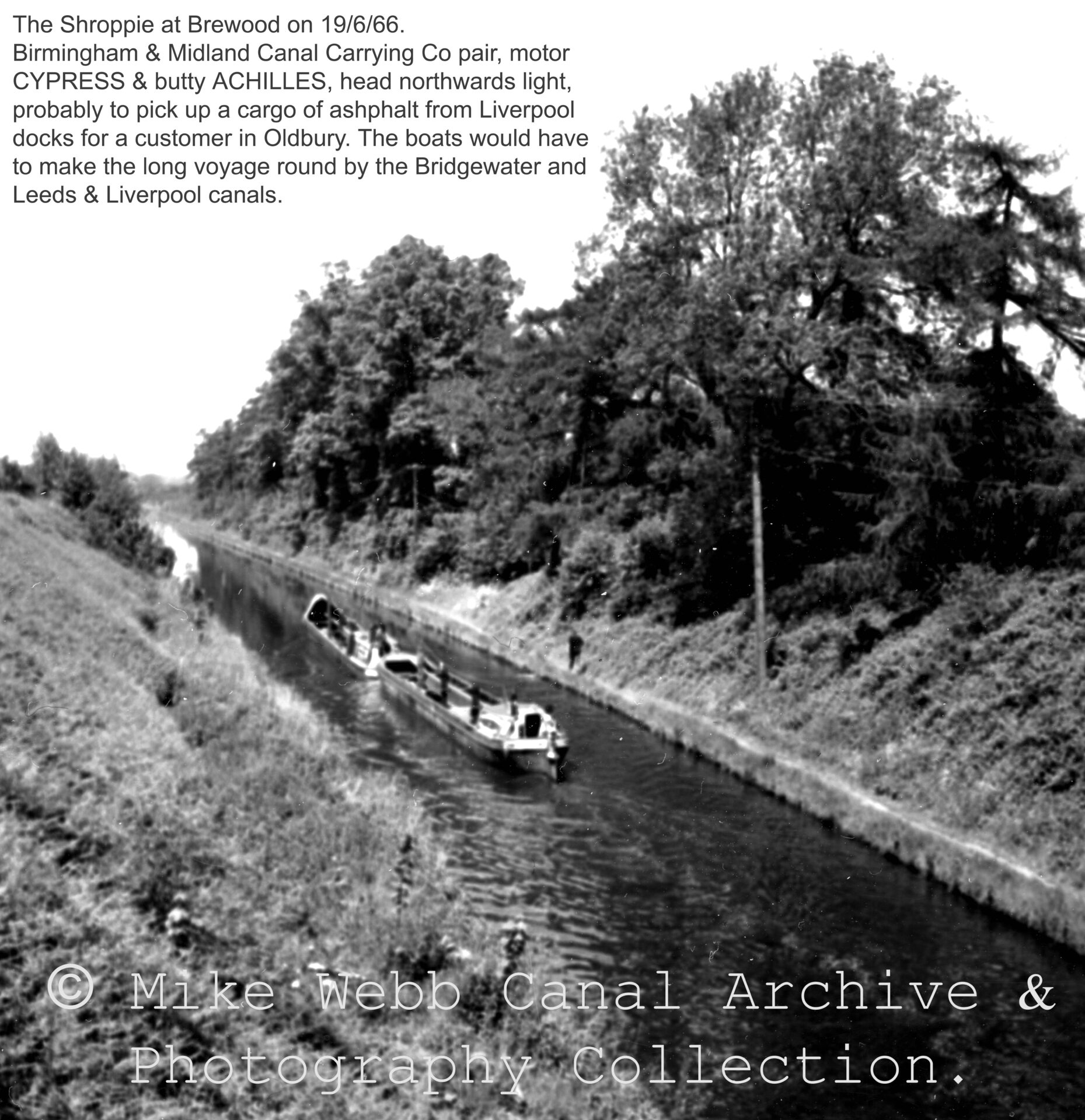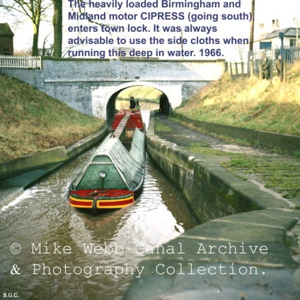 I acquired my first camera in 1958 and immediately began to take photographs of any working boat I was lucky enough to spot on the Shroppie. The next decade witnessed a rather rapid demise in commercial carrying along the Shropshire Union, although the remnants of the British Waterways Northwest fleet were firstly taken over by Willow Wren Canal Transport Services and latterly by the newly formed Anderton Canal Carrying Co. However, by the end of the Sixties, the canal had become increasingly the haunt of pleasure boaters. During this period one or two small outfits bravely carried out a rearguard action notably the Birmingham & Midland Canal Carrying Company and F.B. Lycett of Willenhall. The former Gas Street based organisation carried such commodities as aluminium (Walsall to Liverpool), pitch (Liverpool to Oldbury) and motor oil (Ellesmere Port to Aldridge on the BCN). The photogenic pair, BILSTER and ANGEL, of the Lycett company were often to be seen carrying aluminium from Weston Point Docks to Wolverhampton, sometimes carrying loads of up to 52 tons per pair under the shrewd captaincy of George ‘Jumbo’ Harris who is reputed to have worked for every canal carrying company since the last war!.