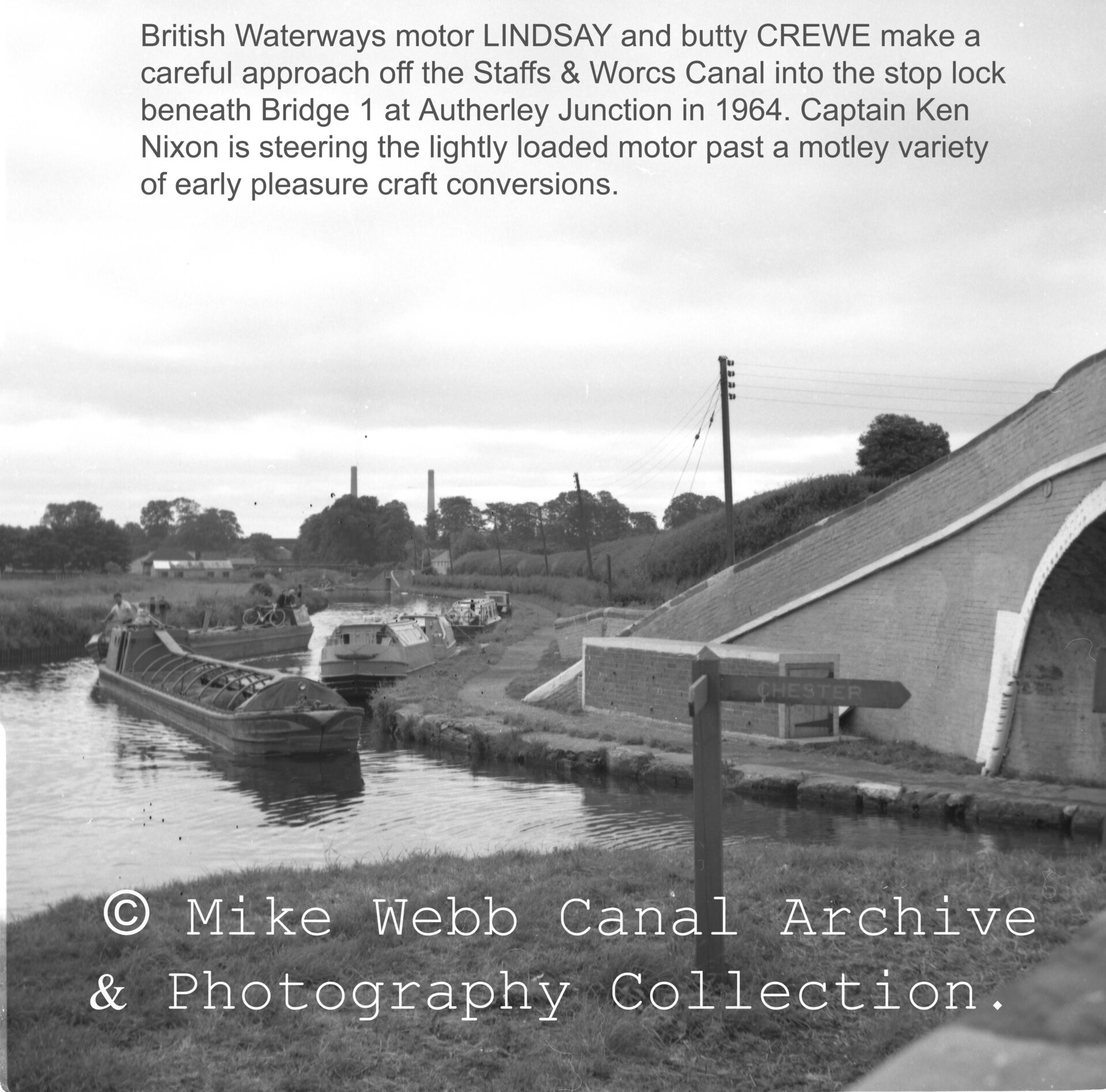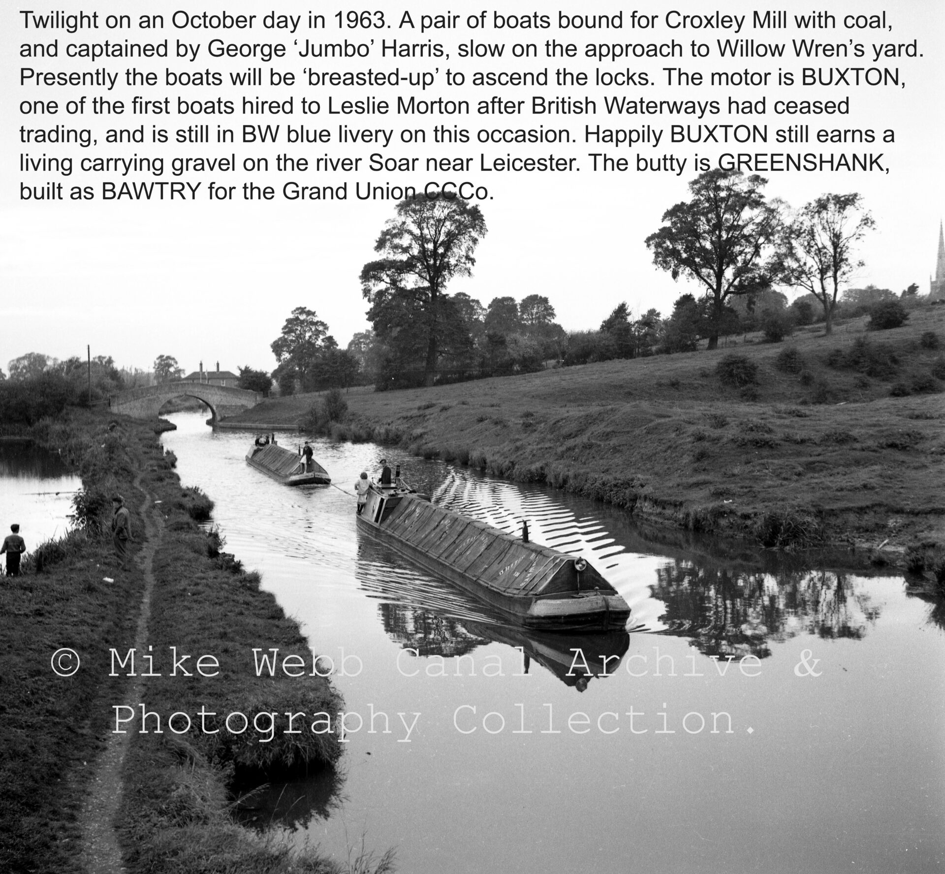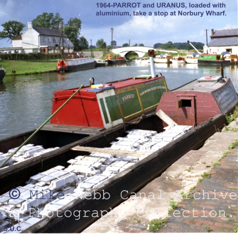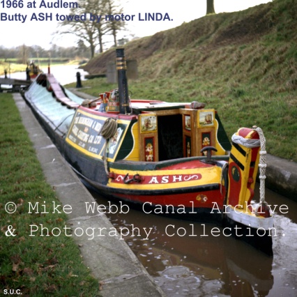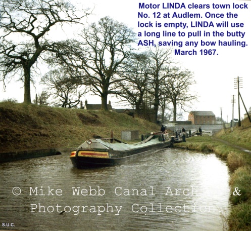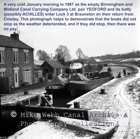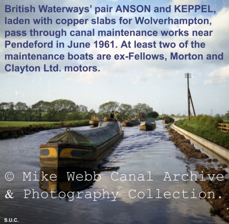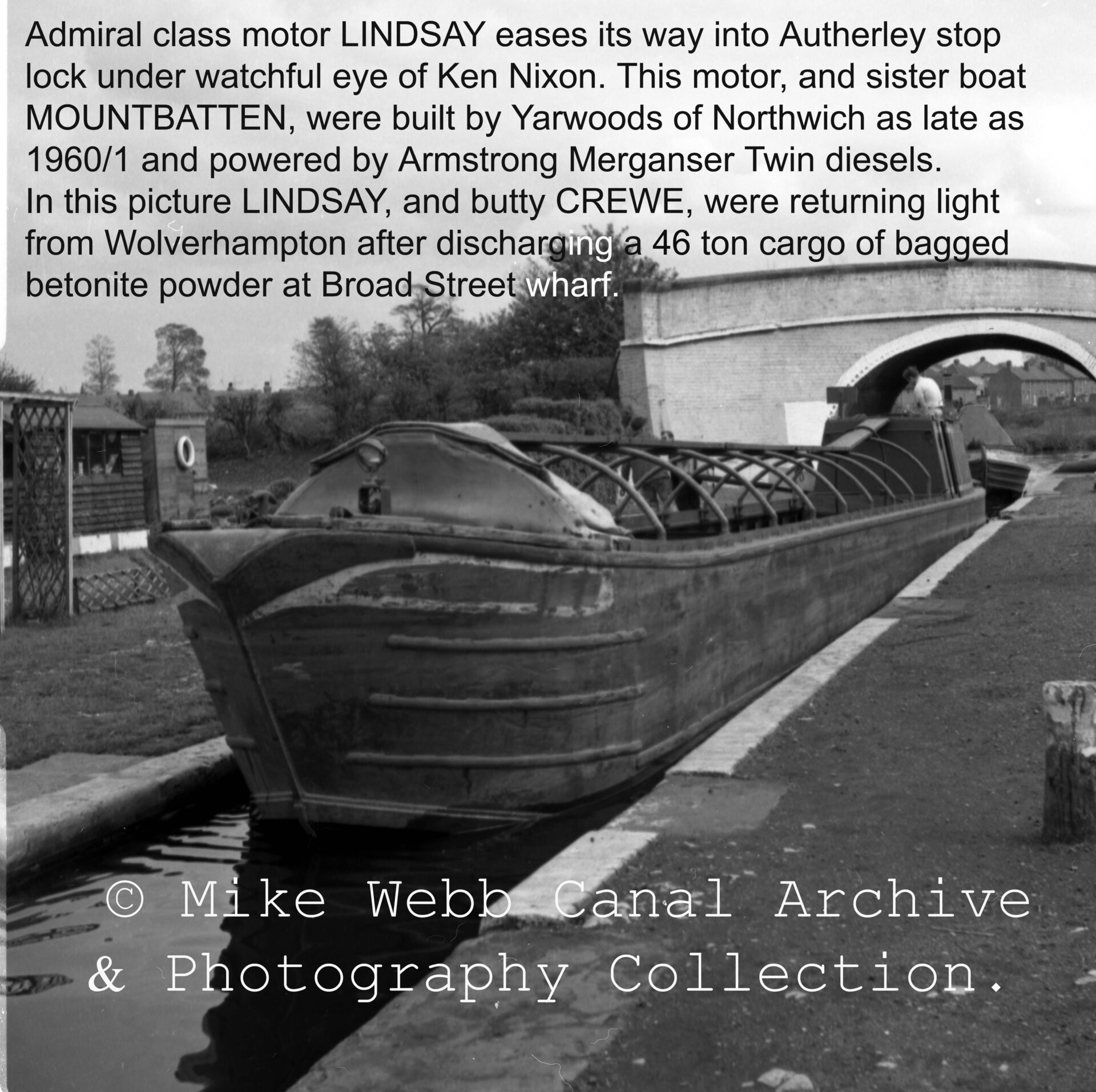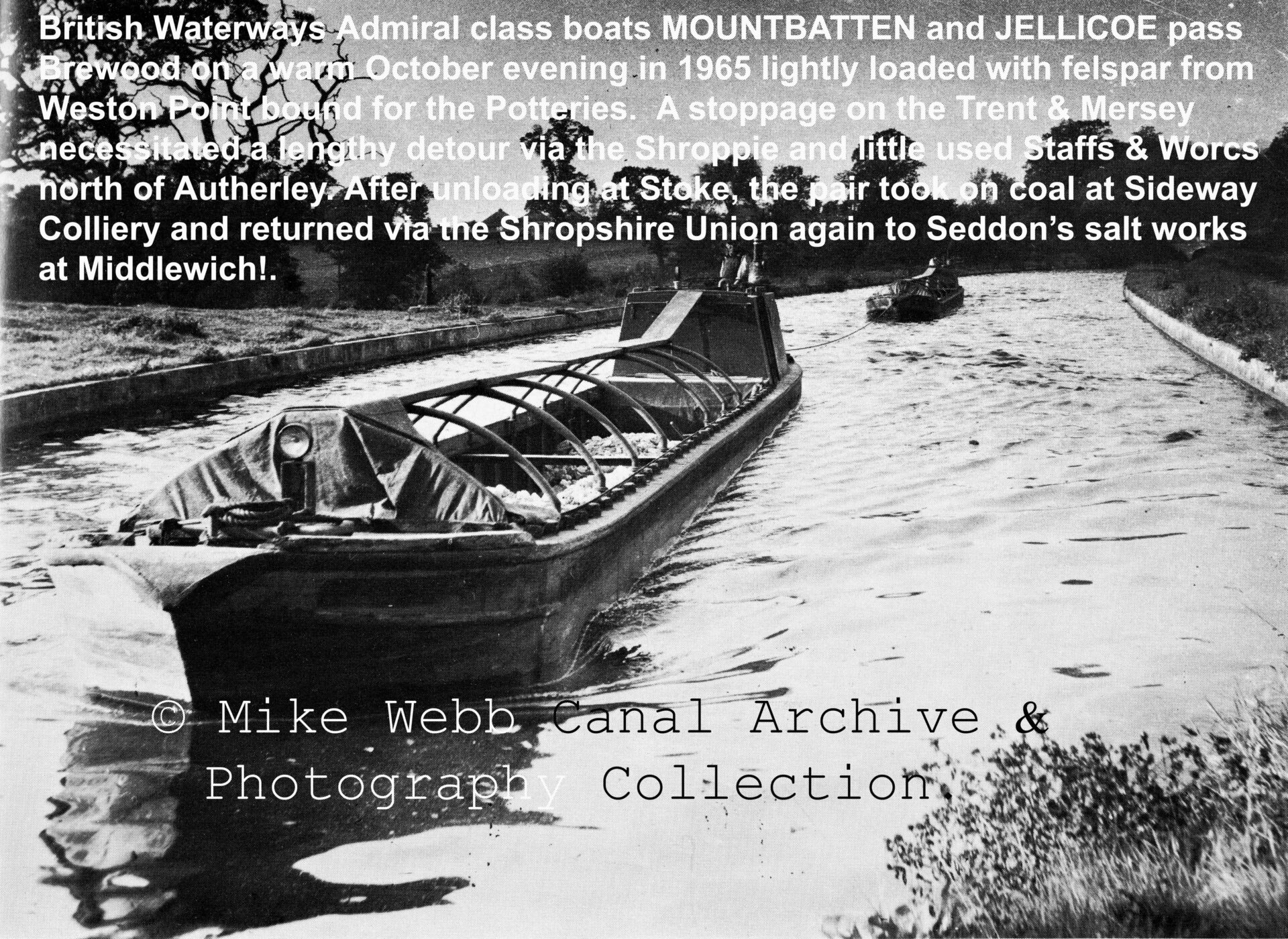 I acquired my first camera in 1958 and immediately began to take photographs of any working boat I was lucky enough to spot on the Shroppie. The next decade witnessed a rather rapid demise in commercial carrying along the Shropshire Union, although the remnants of the British Waterways Northwest fleet were firstly taken over by Willow Wren Canal Transport Services and latterly by the newly formed Anderton Canal Carrying Co. However, by the end of the Sixties, the canal had become increasingly the haunt of pleasure boaters. During this period one or two small outfits bravely carried out a rearguard action notably the Birmingham & Midland Canal Carrying Company and F.B. Lycett of Willenhall. The former Gas Street based organisation carried such commodities as aluminium (Walsall to Liverpool), pitch (Liverpool to Oldbury) and motor oil (Ellesmere Port to Aldridge on the BCN). The photogenic pair, BILSTER and ANGEL, of the Lycett company were often to be seen carrying aluminium from Weston Point Docks to Wolverhampton, sometimes carrying loads of up to 52 tons per pair under the shrewd captaincy of George ‘Jumbo’ Harris who is reputed to have worked for every canal carrying company since the last war!.