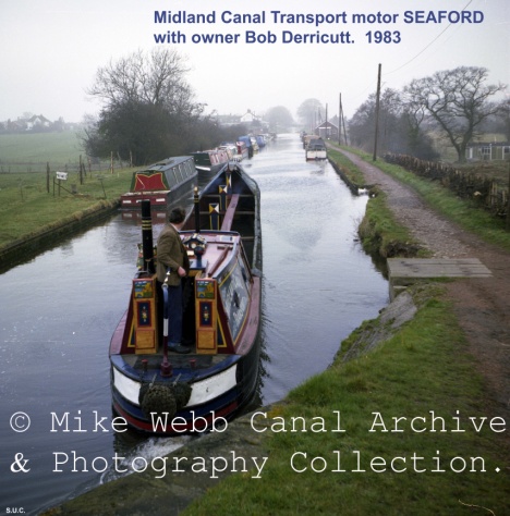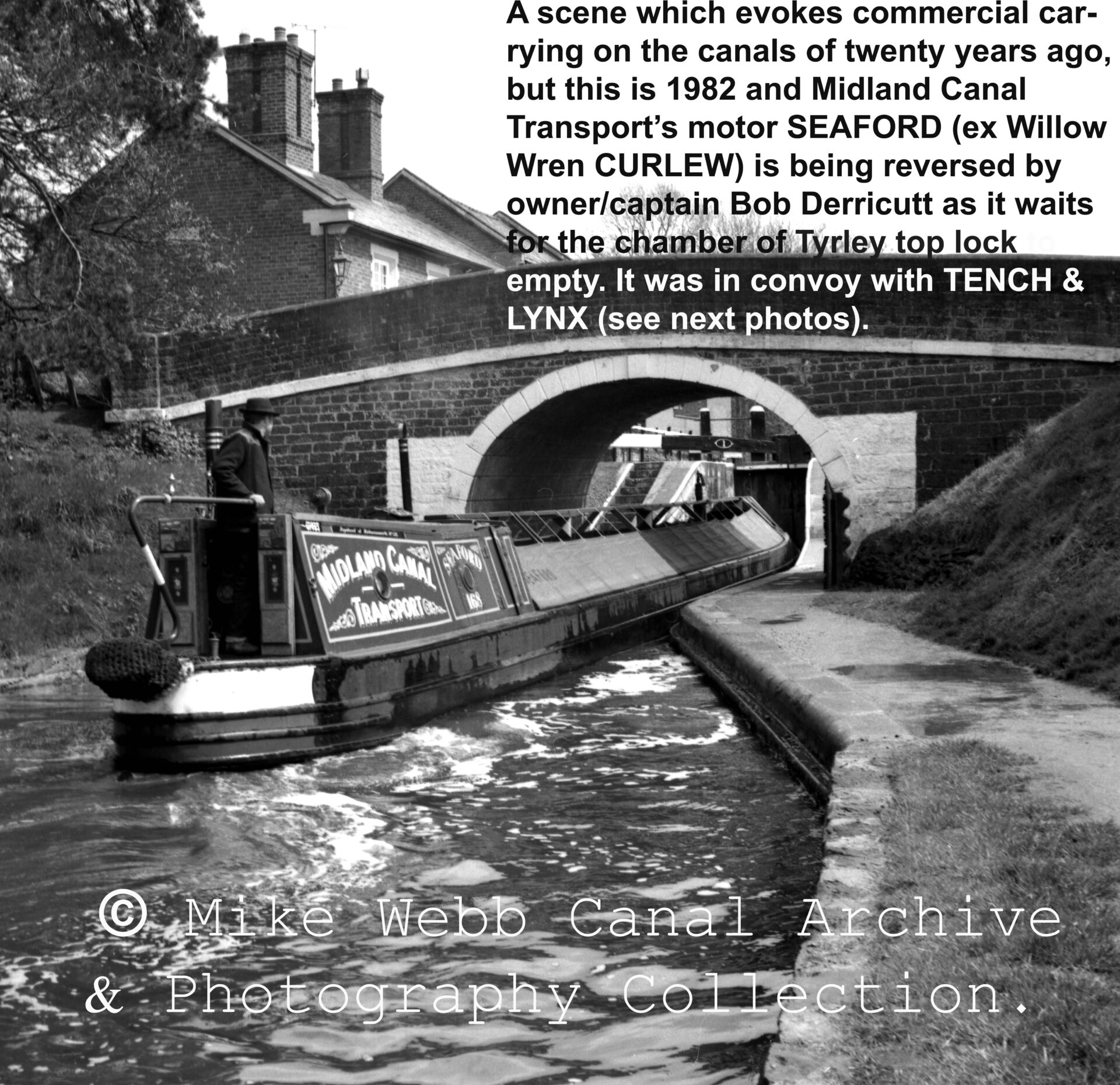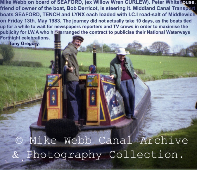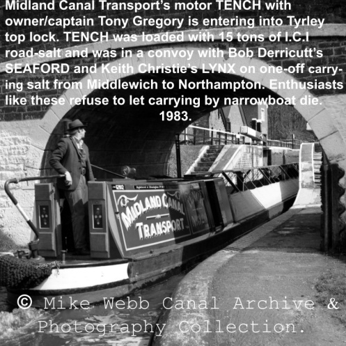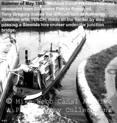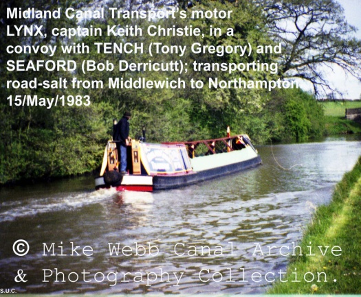Today, to all intents and purposes, commercial carrying on the Shropshire Union Canal has gone. But on occasions, one may still be fortunate enough to see a small convoy of resplendent craft gliding their way through the deep Shroppie cuttings and along the high, windswept embankments. In the Spring of 1982, three narrowboats under the flag of Midland Canal Transport – SEAFORD, TENCH and LYNX – travelled from Middlewich to Northampton via the Sroppie with a special cargo of road salt, catching many an eye and stirring many a memory as they passed along this once mighty waterway.