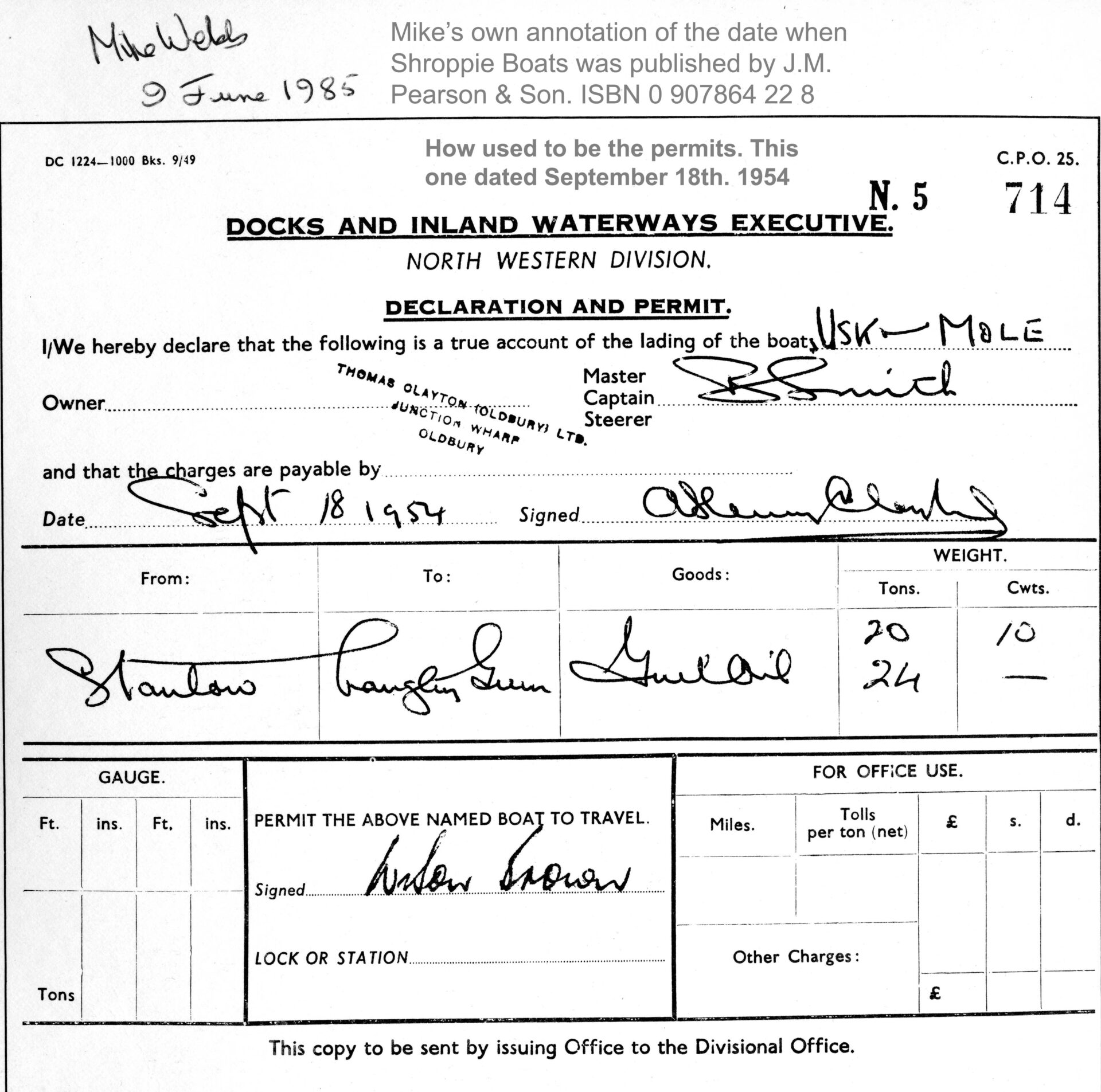 Over the years I naturally became acquainted with many of the people who earned a living on the canal. Autherley Junction was always a busy spot, and here I met the jovial and knowledgeable Sam Lomas, toll clerk and confidant of many boating families. At Autherley the boat captains would hand in or receive gauge chits after their boat had been checked in the stop lock. A boat’s tonnage could be calculated by the process of measuring the amount of freeboard at four points along the hull with a dip stick. From Sam I learnt so much about the Shroppie boat families, their customs and way of life.